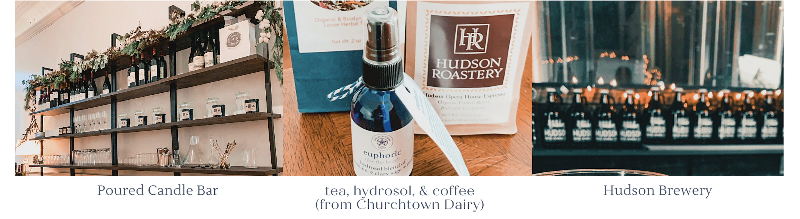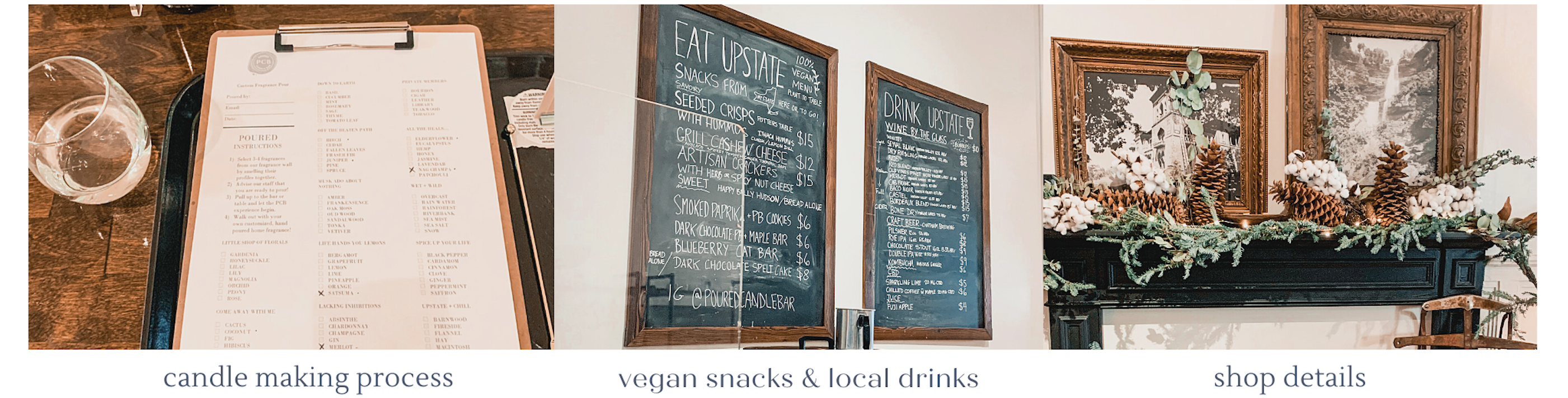 - *Poured Candle Bar: Wine AND custom candle making?! This is a non-negotiable MUST while in Hudson. Poured is just 3 months old and you will have the most unique and best experience of your trip. You are able to completely customize a candle choosing from over 50 scents, even choosing what you want to name it. It’s like science but fun. PLUS all drinks are local and all snacks are both solely vegan and local. I had the chance to meet majority of the lovely staff and cannot rave enough about the experience Poured offers, as well as the fantastic service.